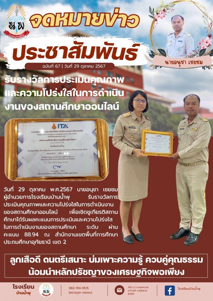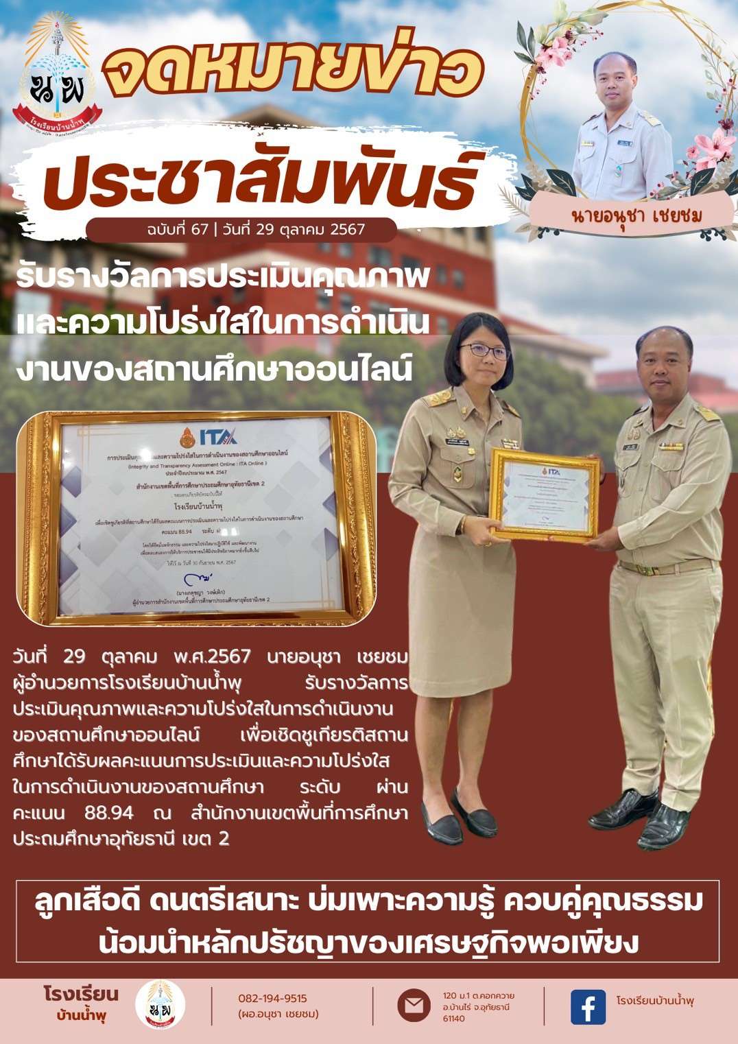 รับรางวัลการประเมินคุณภาพและความโปร่งใสในการดำเนินงานของสถานศึกษาออนไลน์